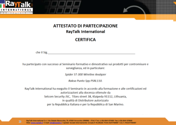 RayTalk International tramite i suoi Docenti certificati dai fabbricanti e Laureati è in grado di svolgere anche Corsi di formazione o di certificazione su specifiche strumentazioni da noi commercializzate, per garantire un corretto utilizzo degli strumenti e un adeguato protocollo di esecuzione ad es. dell’attività di Bonifica Ambientale, su automezzi o hardware.